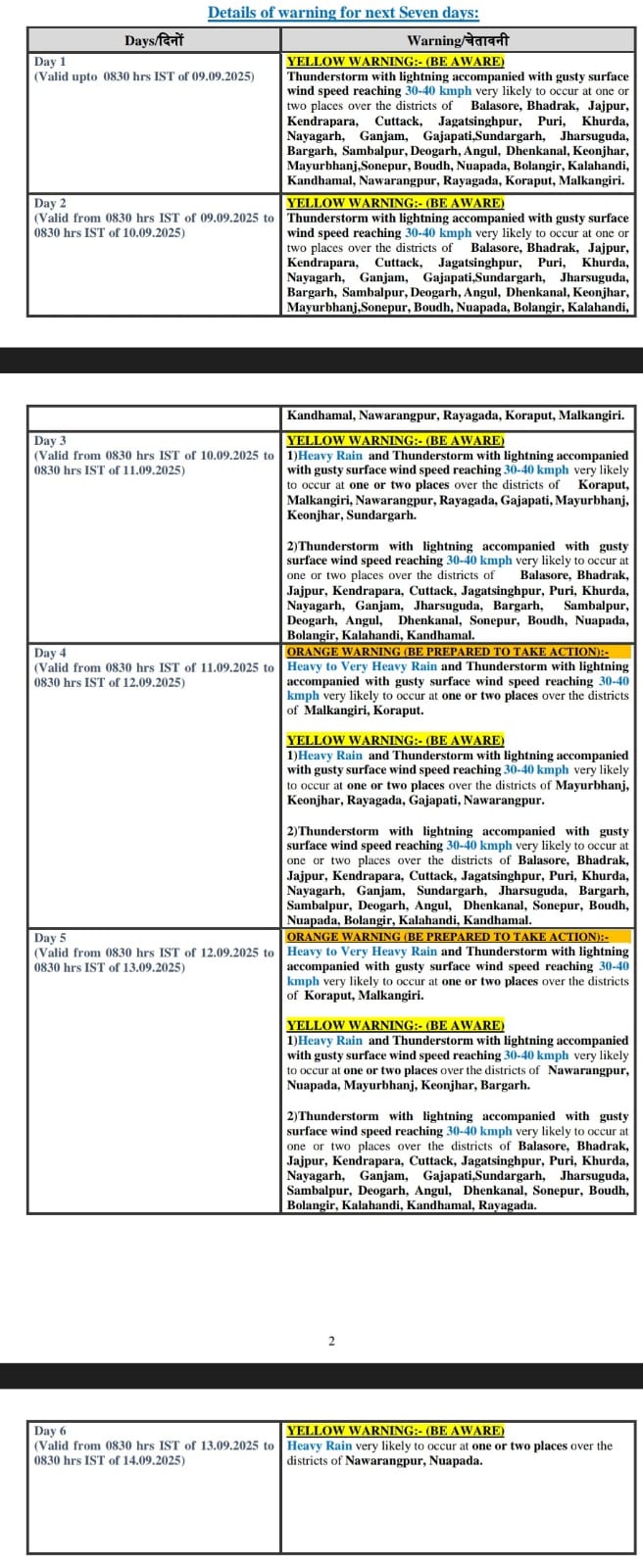 In next 24 hours, thunderstorm with lightning and gusty surface wind speed reaching 30-40 kmph may occur at one or two places over the districts of Balasore, Bhadrak, Jajpur, Kendrapada, Cuttack, Jagatsinghpur, Puri, Khurda, Nayagarh, Ganjam, Gajapati, Sundargarh, Jharsuguda, Bargarh, Sambalpur, Deogarh, Angul, Dhenkanal, Keonjhar, Mayurbhanj, Sonepur, Boudh, Nuapada, Balangir, Kalahandi, Kandhamal, Nabarangpur, Rayagada, Koraput, and Malkangiri. The weather agency has issued a yellow warning for these districts.