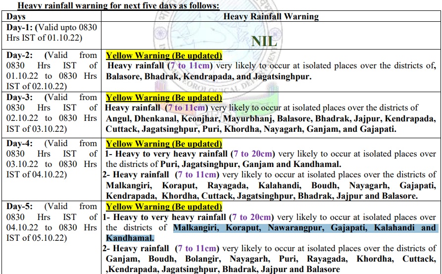 According to the midday bulletin, heavy rainfall is likely in some places in Balasore, Bhadrak, Kendrapada, and Jagatsinghpur districts on October 1 and in Angul, Dhenkanal, Keonjhar, Mayurbhanj, Balasore, Bhadrak, Jajpur, Kendrapada, Cuttack, Jagatsinghpur, Puri, Khurda, Nayagarh, Ganjam, and Gajapati. the following day.