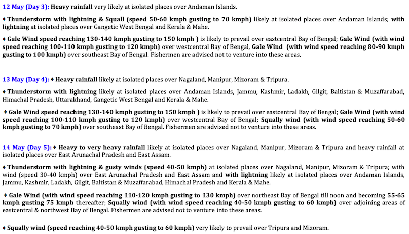 Thereafter, it is likely to recurve gradually, move north-northeastwards and weaken slightly from May 13 and cross southeast Bangladesh and north Myanmar coasts between Cox’s Bazar (Bangladesh) and Kyaukpyu (Myanmar) around forenoon of May 14.