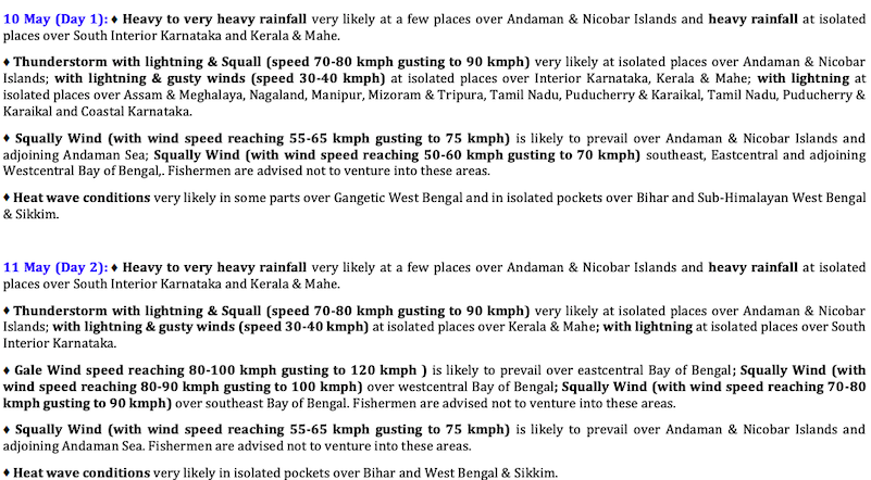 Andaman & Nicobar Islands: Rainfall at most places with heavy to very heavy rainfall at isolated/some places is likely to continue till May 11. Heavy rainfall at isolated places over Andaman Islands is likely on May 12.