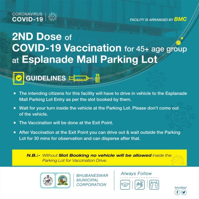 As per a tweet by the BMC, people in the 45 plus age group citizens, who have taken their first dose at government or private facility of Bhubaneswar can book slot at Esplanade centre.