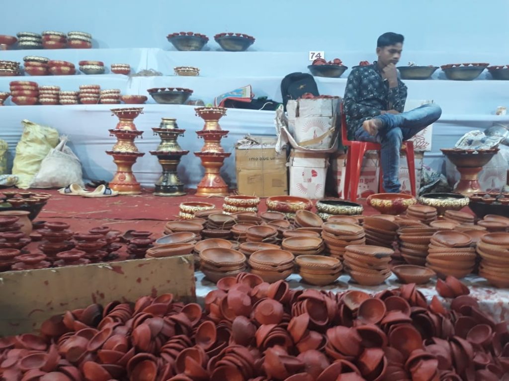 Kaikeyi and Binodhar Rana have been participating in the fair since the last four years. According to them, the business this year seems a little bleak. They are selling ‘diyas’ of different shapes, sizes and colours.
