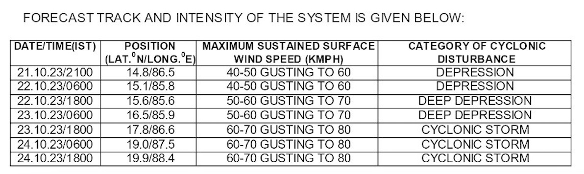 \r\n\r\nThe MeT office has already stated that the system is likely to further intensify into a deep depression and move northwestwards, and then recurve and move north-northeastwards during subsequent 3 days towards Bangladesh and adjoining West Bengal coasts.\r\n\r\nThe IMD has also forecast the system’s probable track and intensity of the system and is likely intensification into a cyclonic storm by October 24. If this system intensifies into cyclone, it will be called Hamoon, a name given by Iran.\r\n\r\n\r\n\r\nUnder its influence, light to moderate rainfall is likely at many places with isolated heavy rainfall accompanied with thunderstorm, lightning & gusty winds very likely over Kerala on October 22-23 and light to moderate rainfall at isolated places with isolated heavy rainfall accompanied with thunderstorm & lightning over Tamil Nadu on October 22.\r\n\r\nAlso Read: Deep Depression Over Bay In 12 Hours; Check Rain & Wind Warning For Coastal Odisha\r\n\r\nCoast districts of Odisha are also likely to experience light to moderate rainfall at a few places on Monday and at many places on October 24 and 25.\r\n\r\nAlso Read: Cyclonic Storm Likely Over Bay Of Bengal By Oct 24; Check Track, Intensity & Warning","author":{"@type":"Person","name":"OB Bureau","url":"https://odishabytes.com/author/bureauob/","sameAs":["https://www.odishabytes.com","BytesOdisha"]},"articleSection":["Featured","Odisha"],"image":{"@type":"ImageObject","url":"https://assets.odishabytes.com/wp-content/uploads/2023/10/IMD-DG-e1697977586455.jpg","width":818,"height":490},"publisher":{"@type":"NewsMediaOrganization","name":"OdishaBytes","url":"https://odishabytes.com","logo":{"@type":"ImageObject","url":"https://odishabytes.com/wp-content/uploads/2024/11/Odisha-Byyes-Logo150-min.png"},"sameAs":["https://www.facebook.com/odishabytes/","https://x.com/BytesOdisha","https://www.youtube.com/channel/UCZzaxCAclS9UoMtl51XuXkQ","https://odishabytes.com/feed/","https://news.google.com/publications/CAAqKggKIiRDQklTRlFnTWFoRUtEMjlrYVhOb1lXSjVkR1Z6TG1OdmJTZ0FQAQ?hl=en-IN&gl=IN&ceid=IN%3Aen"]},"isAccessibleForFree":true}