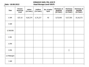 Bhubaneswar: The water level in Hirakud dam was 625.10 ft at 6 am on Thursday. The water level in the reservoir was 626.12 ft at 8 pm on Wednesday and 626.17 ft at 6 pm on Wednesday.