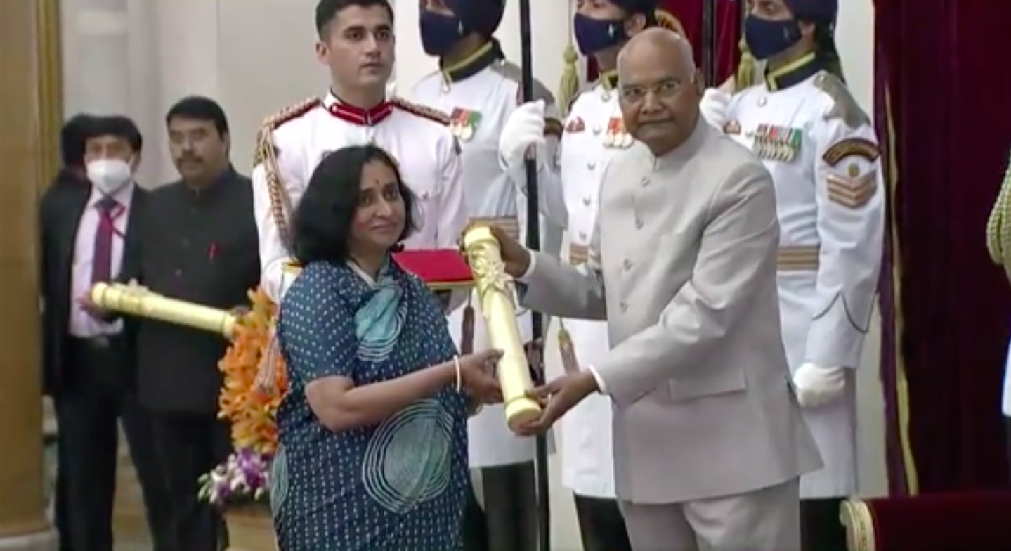 Anjali Mohapatra, wife of Former Union Secretary late Guru Prasad Mohapatra received the award from the President.