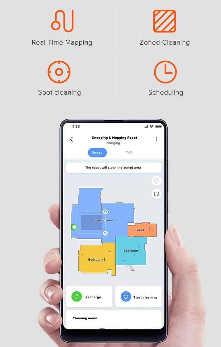 The cleaner navigates, identifies, and saves the location of each room as a map on the Mi Home app after its first cleaning drive. Users can also name the rooms, divide areas, create virtual walls accordingly.