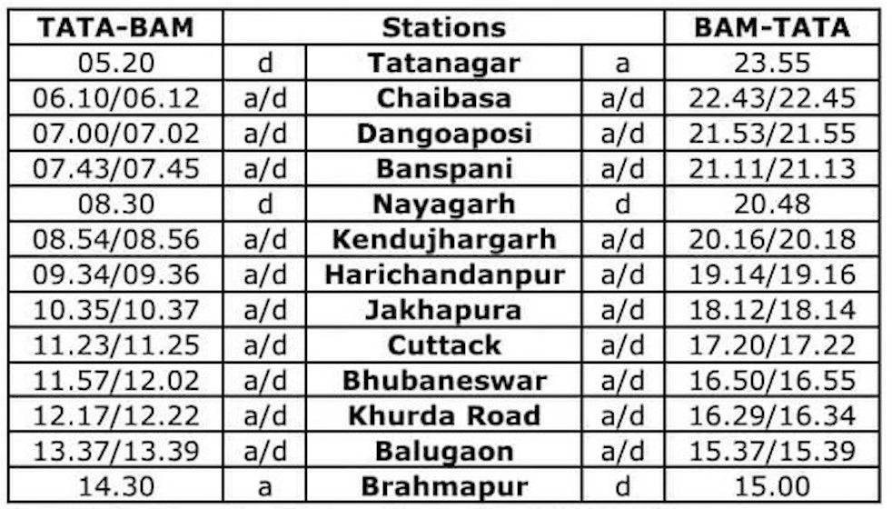 Sources further said that the train is expected to take nine hours and ten minutes to cover 586 km after leaving Tatanagar at 5.20 am and arrive in Berhampur at 2.30 pm with halts at Banspani, Nayagarh, Keonjhargarh, Harichandanpur, Jakhapura, Cuttack, Bhubaneswar, Khurda Road and Balugaon in Odisha. In the return journey, it will leave Berhampur at 3 pm and reach Tatanagar at 11.55 pm the same day. It will run six days a week expect on Tuesdays.