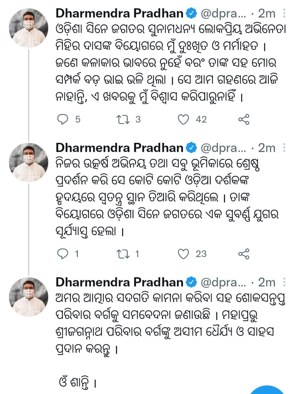 ବର୍ଷୀୟାନ ଅଭିନେତା ମିହିର ଦାସଙ୍କ ଦେହାନ୍ତ ବିଷୟରେ ଜାଣି ମୁଁ ଦୁଃଖିତ। ଓଡ଼ିଆ କଳା ଜଗତରେ ସେ ଛାଡିଯାଇଥିବା ଅଭିନୟର ଛାପ ତାଙ୍କୁ ସର୍ବଦା ଅମର କରି ରଖିବ। ତାଙ୍କ ବିୟୋଗ ଓଡ଼ିଆ କଳାଜଗତ ପାଇଁ ଏକ ଅପୂରଣୀୟ କ୍ଷତି। ତାଙ୍କ ଅମର ଆତ୍ମାର ସଦଗତି କାମନା କରିବା ସହ ଶୋକସନ୍ତପ୍ତ ପରିବାରବର୍ଗଙ୍କ ପ୍ରତି ମୋର ସମବେଦନା ଜଣାଉଛି।