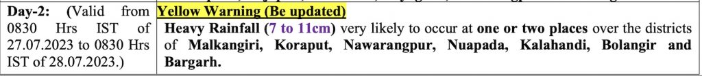 Orange warning for heavy to very heavy rain (7 to 20cm) has been issued for isolated places in Malkangiri and Koraput till 8.30 am on Thursday. Heavy Rainfall (7 to 11cm) is also likely at one or two places in Nuapada, Gajapati, Kalahandi, Rayagada, Nabarangpur and Balangir.