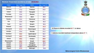 According to evening bulletin of India Meteorological Department (IMD)The other , as many as 10 places in western Odisha recorded temperature of 40 degree Celsius or more on the day. Four places in the region registered 41 degree or more.