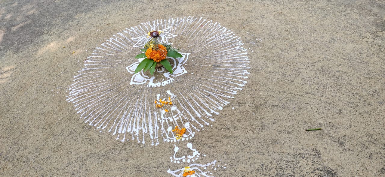 Womenfolk decorate the entrance to their homes with aesthetically designed motifs called Chita using semi liquid rice paste or pithau. The main Chita include ‘Laxmi Paada’  (feet) or lotus, the favourite flower of the Goddess and other beautiful creations.