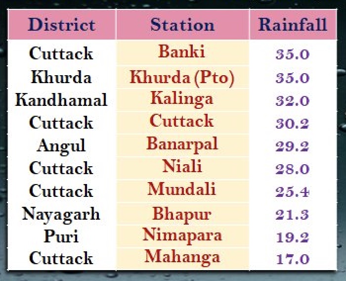 Amid a few spells of heavy rain, the state capital Bhubaneswar recorded 33.8 degree Celsius, 1.2 degrees below normal, in the last 24 hours, while the mercury dropped to 31.6 degree Celsius, 3.2 degrees below normal, in twin city Cuttack. The highest day temperature of 37 degree Celsius was recorded at Paralakhemundi in Gajapati district followed by Rayagada and Malkangiri at 36 degree Celsius each.