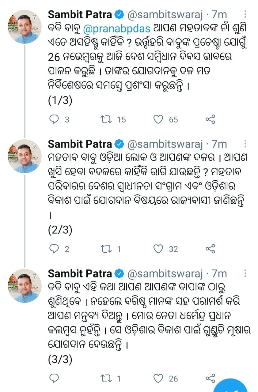 BJP national spokesperson Sambit Patra accused the regional party of being intolerant in a series of tweets. “People are well aware of the contribution of Mahtab family towards India’s freedom and Odisha’s development,” he wrote.