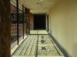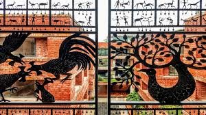 The light fixtures and metal screens in the corridors exhibit the best of tribal craft of Dhokra. Locally-sourced locally-sourced laterite and khondalite stones have been used in the building. It has beautifully hand-carved khondalite lattices and bas-relief carvings in the Odia Pattachitra style in laterite stone, depicting agricultural motifs.
