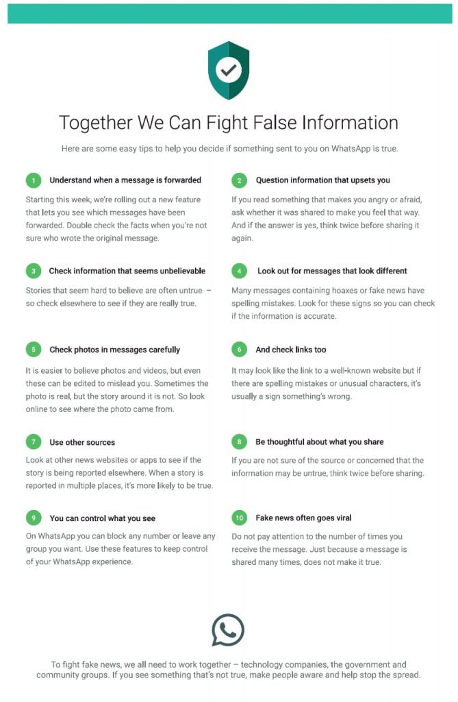 Bhubaneswar: Messaging application WhatsApp, on Tuesday carried full page ads in all major newspapers of the country, creating awareness against false news with 10 tips to help people decide if the news is true.