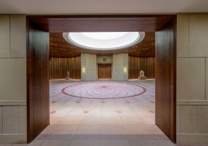 The new building is triangular in shape, mostly because the plot of land that it is built on is triangle. Architect Bimal Patel said that the shape meets several aspects of both design and symbolic significance and is also a nod to the sacred geometry in various religions. “Many sacred geometrics celebrate ‘triangles’ and ‘trinities’. The Sri Yantra uses a triangle, the three Gods or the Trinities are a triangle and therefore the triangle is sacred.”