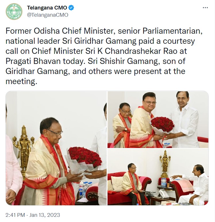 Meanwhile, chief minister’s office of Telangana, in a tweet, said Giridhar Gamang paid a courtesy call on Chief Minister K Chandrashekar Rao at Pragati Bhavan. Shishir Gamang and others were present at the meeting.