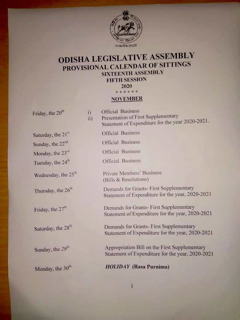 Bhubaneswar: The winter session of the Odisha Assembly will begin from November 20.