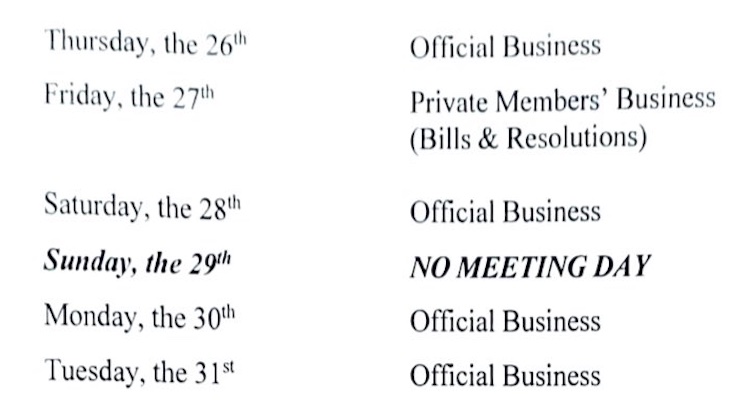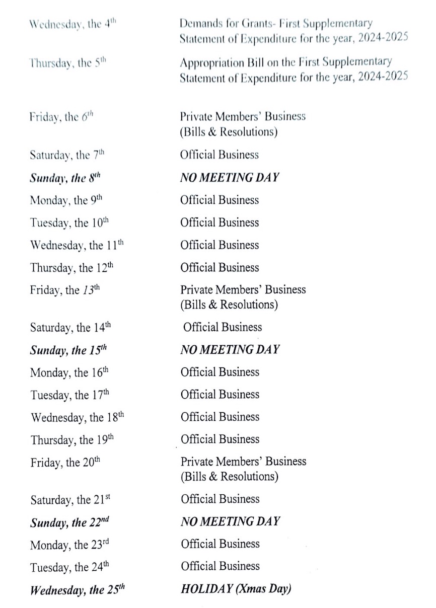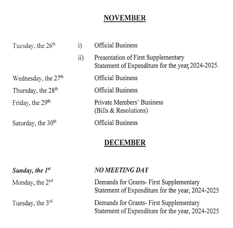 There will 5 business days in November and 25 in December. The First Supplementary Statement of Expenditure for 2024-25 will be presented on November 26, the State Assembly Secretariat stated.