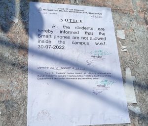 A notice issued by the office of the Principal of Mahamayee Mahila Mahavidyalaya in Berhampur stated that the students are not allowed to bring Smart phone to the college campus from July 30. The security guards and lecturers of the women’s college carried out checking of the students in front of the main gate on Friday.
