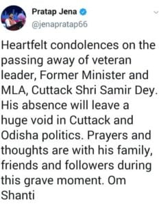 In October, Law Minister Pratap Jena tweeted his condolences on the death of former Cuttack MLA Samir Dey, which turned out to be a hoax.
