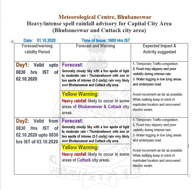 Bhubaneswar: The Meteorological Centre here has issued yellow warning of heavy rain for the twin cities of Bhubaneswar and Cuttack till October 3.
