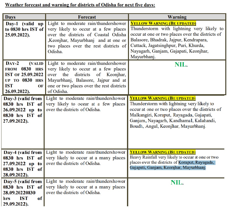 Its midday bulletin forecast heavy rainfall on September 27. A yellow warning for thunderstorms have been issued for Balasore, Bhadrak, Jajpur, Kendrapara, Cuttack, Jagatsinghpur, Puri, Khurda, Nayagarh, Ganjam, Gajapati, Keonjhar and Mayurbhanj districts till 8.30 am on September 25.