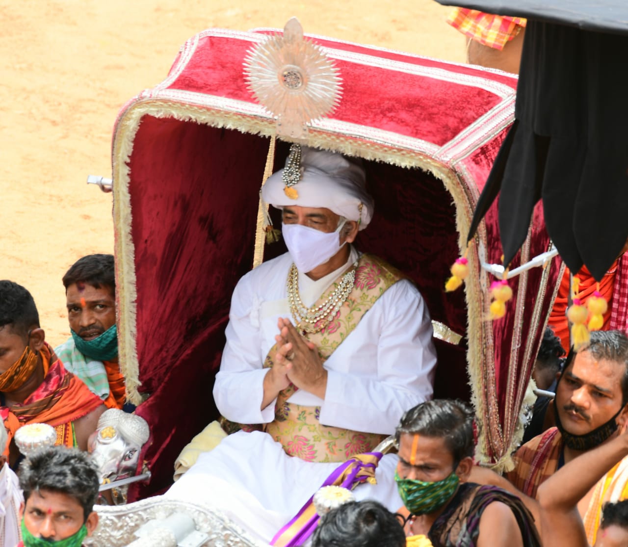 Gajapati Maharaja Dibyasingha Deb performing Chhera Pahanra ritual on the chariots.